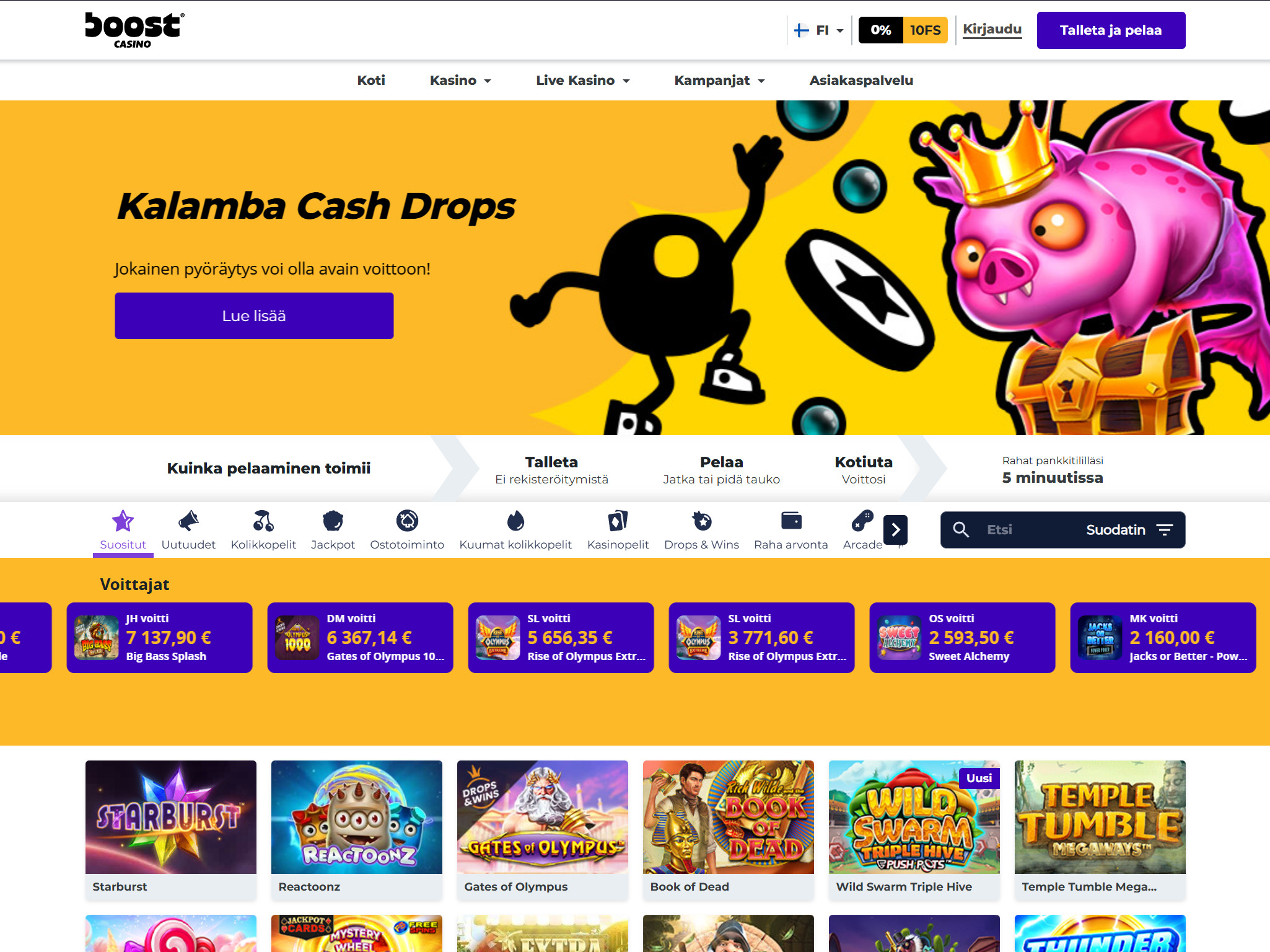 Boost Casino on ihanteellinen valinta pelaajille, jotka etsivät laadukasta pelivalikoimaa, anteliaita bonuksia, ja ensiluokkaista käyttäjäkokemusta. Sen moderni alusta, nopeat maksutavat ja erinomainen asiakaspalvelu takaavat, että jokainen pelisessio on nautinnollinen. Uhkapeluri.com suosittelee Boost Casinoa lämpimästi kaikille suomalaisille pelaajille, jotka etsivät jännittävää ja palkitsevaa pelikokemusta.