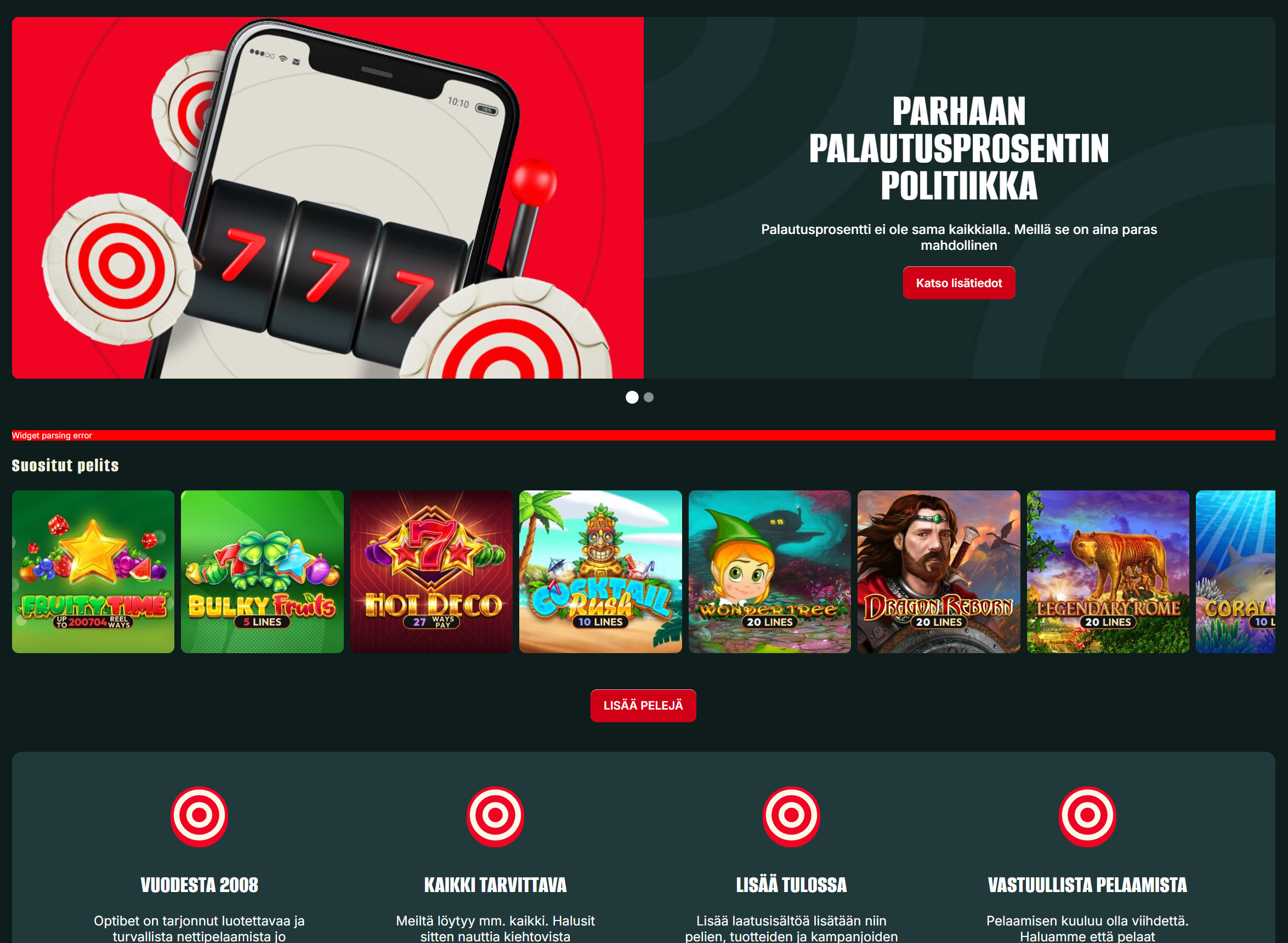 Optibetin pelivalikoima on huolella kuratoitu, sisältäen suosittuja kolikkopelejä, pöytäpelejä ja jackpot-pelejä parhailta pelintarjoajilta. Lisäksi kasinon vedonlyöntipuoli tarjoaa kattavat mahdollisuudet urheiluvedonlyöntiin monilla eri markkinoilla. Live-kasino tuo pöytäpelit eloon ammattitaitoisten jakajien avulla, tarjoten autenttisen kasinokokemuksen kotisohvalta käsin. Vedonlyöntipuolesta on erikseen mainittava, että tarjolla on paljon erilaisia kertoimia suomalaisten suosikkilajeihin ja sarjoihin, kuten Veikkausliigaan ja SM-liigaan. Kattauksesta löytyy paljon vetotyyppejä edellä mainittuhin sarjoihin ja liigoihin, lähtien yli- ja alivedot, sekä erilaiset voittaja- ja erikoisvedot.