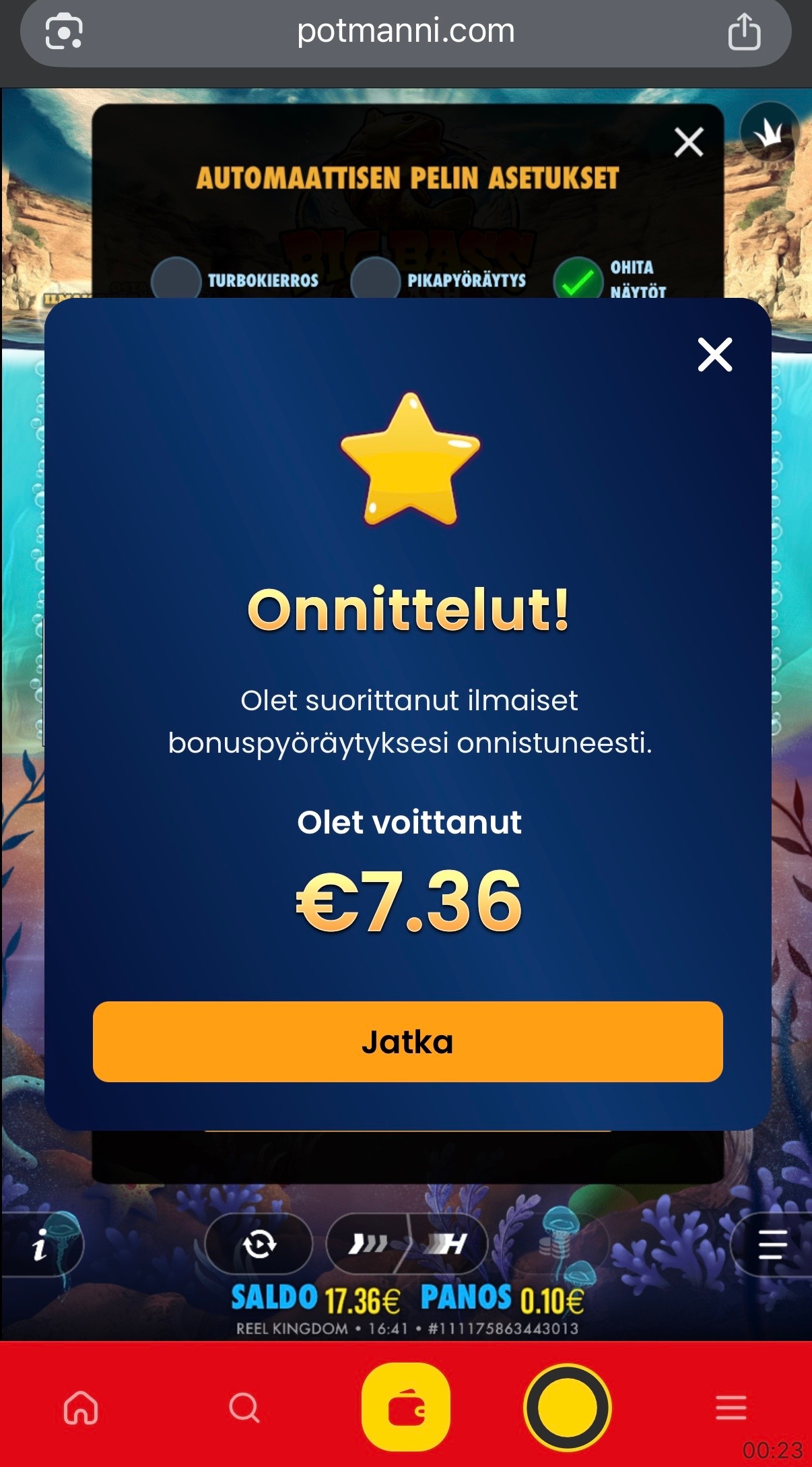 Näistä kahdesta valitsimme ensimmäisen ja onnistuimme voittamaan tarkalleen 7,36 euroa. (Katso kuva)