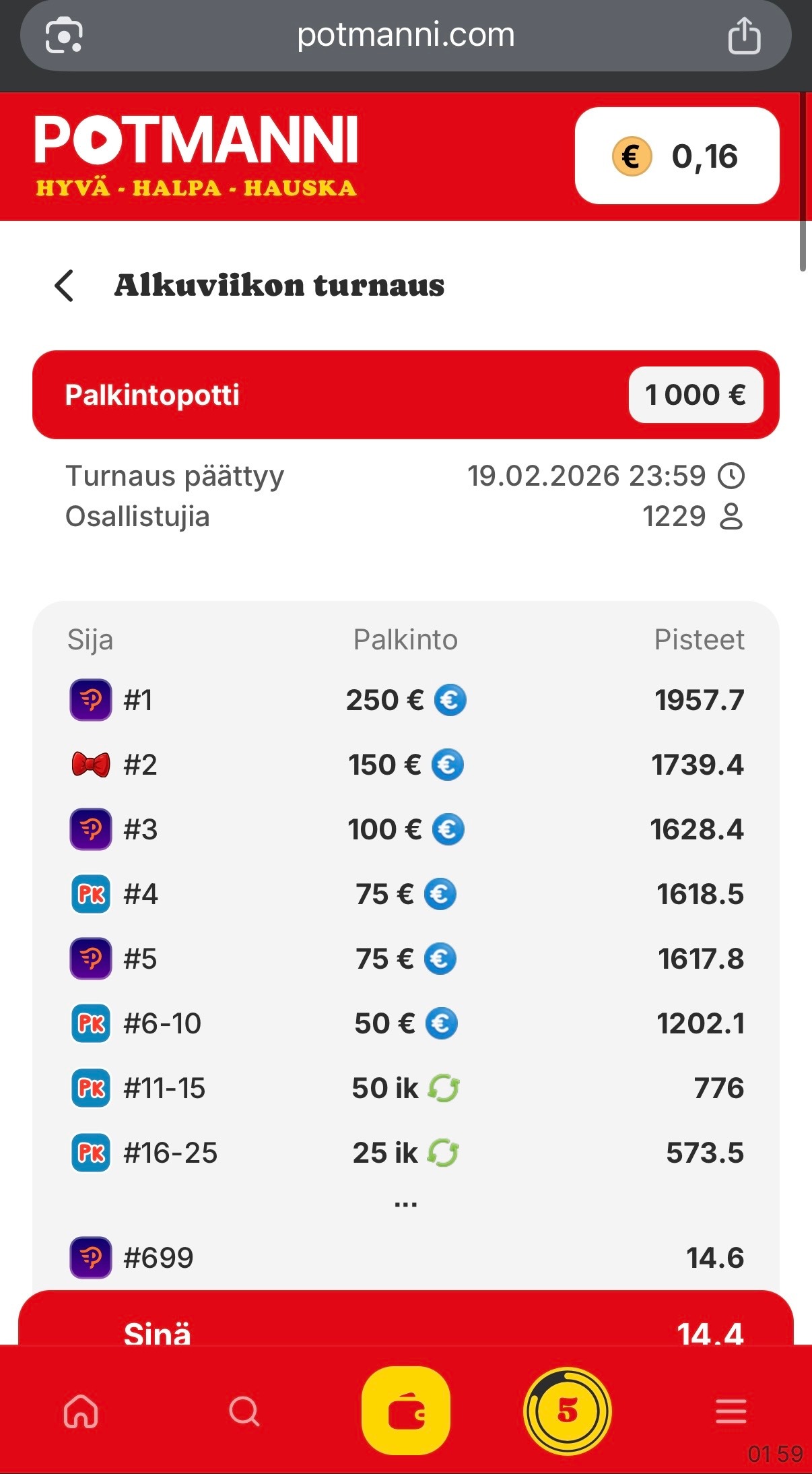 Kuponkien lisäksi Potmannin sivujen kautta on mahdollista osallistua MagicPoron kaikkien kasinoiden kesken järjestettäviin turnauksiin, joissa on palkintona käteistä ja pyöräytyksiä. Turnauksissa pärjäämiseksi sinun tulee pelata listattuja pelejä, kerätä pisteitä ja nousta sitä kautta mahdollisimman korkealle tulostaulukossa. (Katso kuva)
