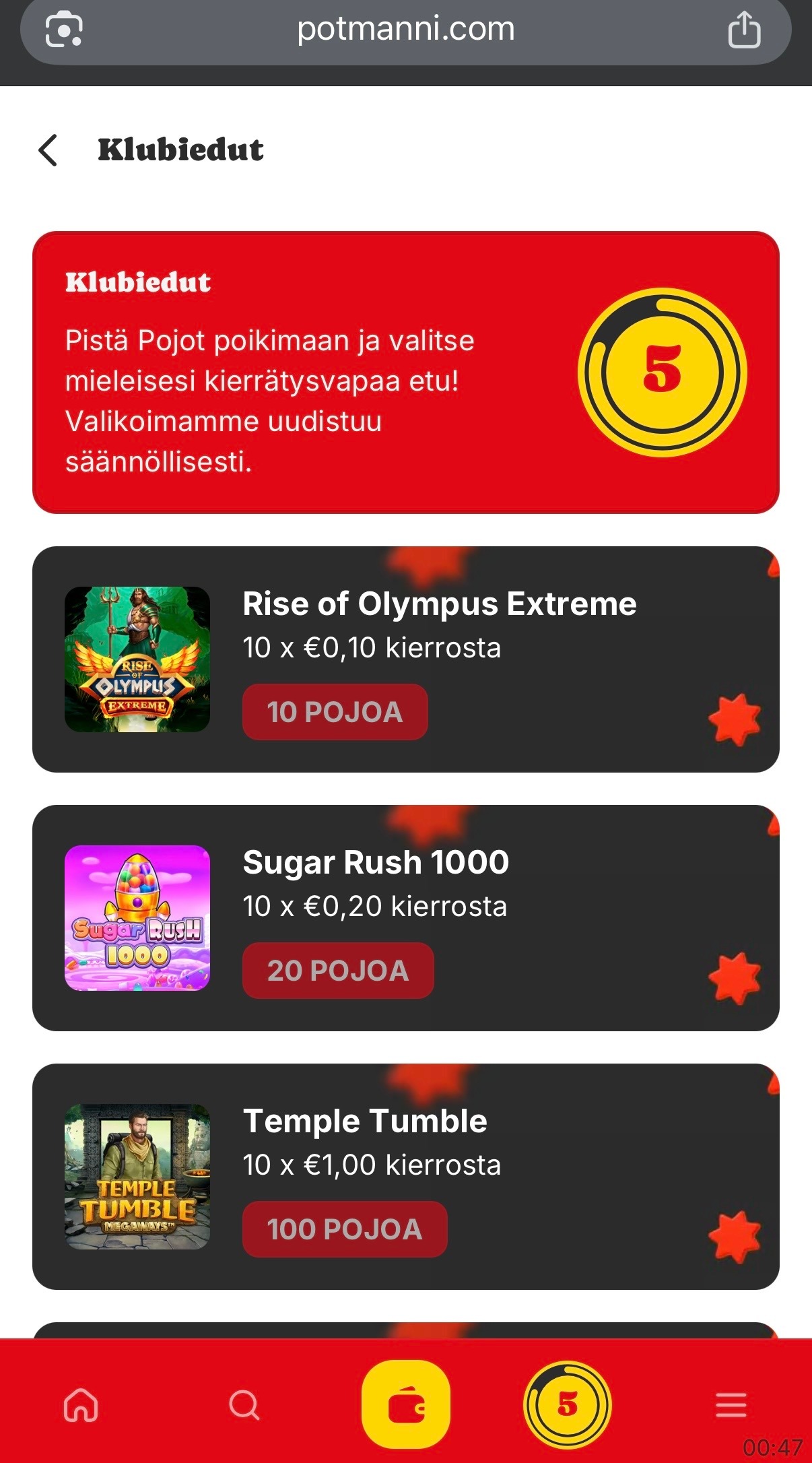 Myöskin Potmanni kasino tarjoaa oman VIP-ohjelmansa, Klubin. Kyseisen *ohjelman kautta voit napata kierrätysvapaita etuja, kuten ilmaiskierroksia ja käteistä, pelaamisen kautta keräämilläsi “pojoilla” eli pisteillä**. Tässä esimerkkejä uskollisuusohjelman valikoimasta: