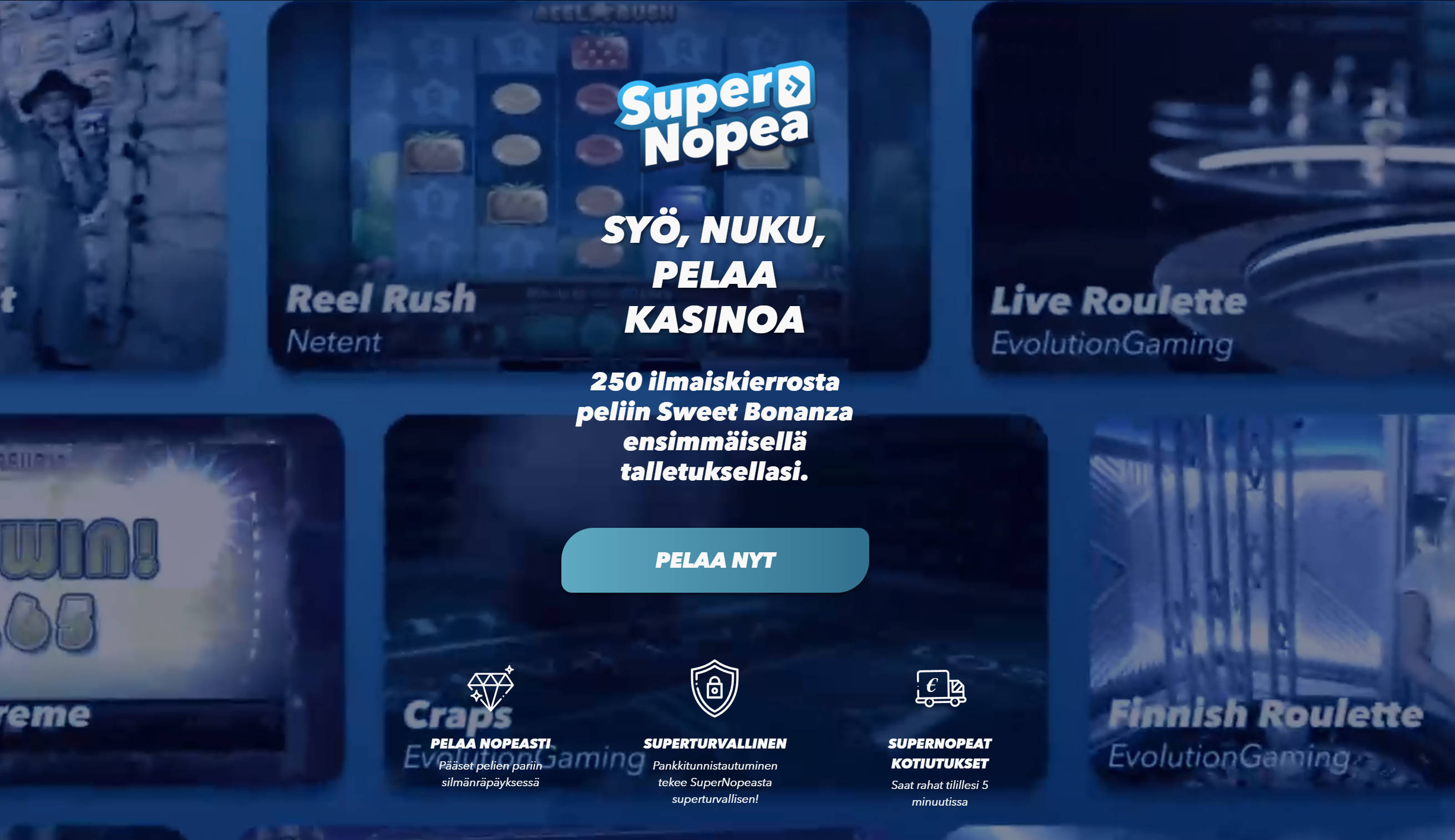 SuperNopea-casinon nimi jo kertoo, kuinka asiat tällä casinolla hoidetaan. Casino on panostanut paljon siihen, että kaikki toiminnot olisivat ripeitä ja pelaamaan pääsee mahdollisimman helposti. SuperNopealla sinun ei tarvitse näpytellä tietojasi pientä ikuisuutta, koska pelaamisen pyörteisiin pääset suoraan käyttämällä verkkopankkitunnuksiasi. SuperNopea-netticasino toimii erinomaisesti sekä tietokoneella että mobiililaitteilla. Mobiilipelaaminen on otettu vahvasti huomioon, jotta pelikokemus olisi aina erinomainen, pelasit sitten pienellä tai suurella näytöllä.
